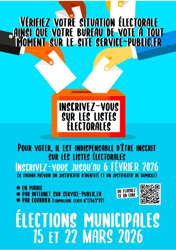 Pour voter, vous devez être inscrit sur la liste électorale en mairie. Si ce n’est pas le cas, nous vous invitons à vous inscrire en mairie en fournissant un justificatif de moins de 3 mois, à votre nom et mentionnant l’adresse de votre domicile sur la commune avant le 6 février 2026.